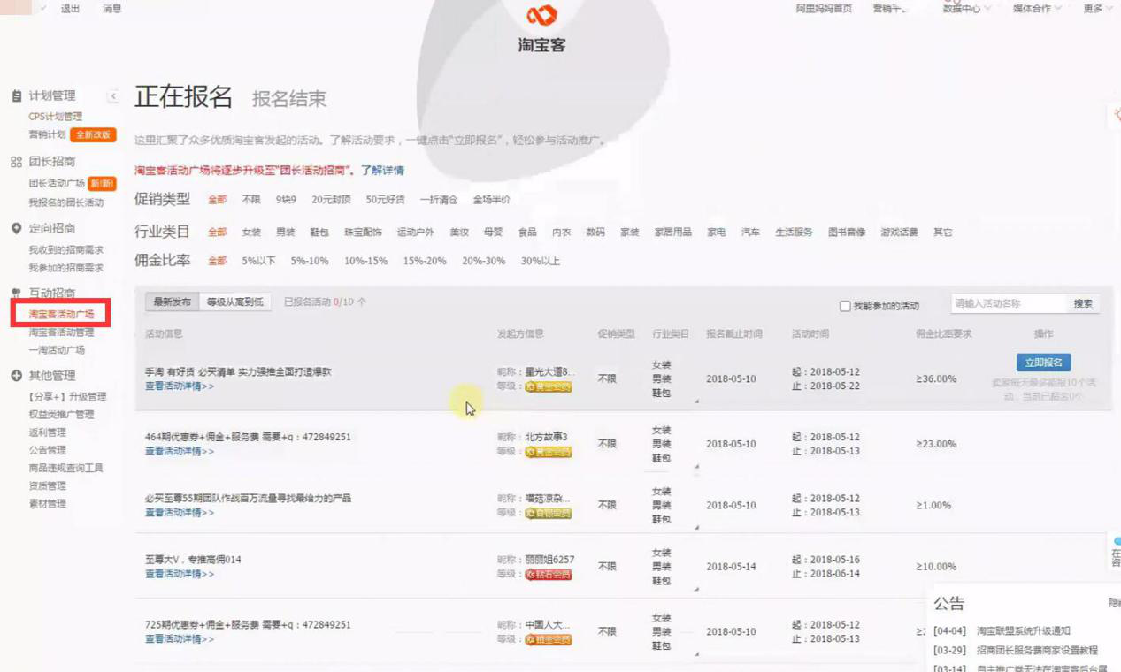 去淘宝客的活动广场报名活动,每天可以报十次,总会有机会报上的,但是在这里提醒小卖家们一点,你们现在做淘宝客是赚不到钱的,因为你们是新手卖家,想要吸引淘客点击,必须设置高佣金计划。但你要清楚,我们宝淘宝客活动的目的不是为了打造爆款,而是为新店增加流量。