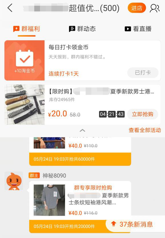 淘宝群聊能玩的法子很多,偶尔发红包能让群里的氛围变得活跃,拼团活动、限时抢购、提前购等等活动,让你群里的成员每天都能感受到店铺的活跃,甚至可以分享你的微淘内容到群聊里,这些都属于你的私域流量,每一个粉丝你把握住了,还怕店铺没流量吗?