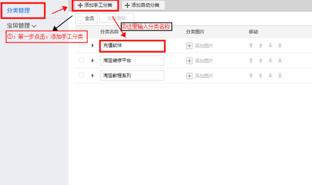 2.进入分类管理页面,可以看到有添加手工分类与添加自动分类两项。下面我们先来说添加手工分类,点击添加手工分类,在下方出现的分类框中填入分类名称,之后添加分类图片。按照次序对所要进行分类的产品这些类型进行填写,全部分类填写完成之后,点击保存按钮进行保存。接着在全部宝贝中点击未分类的宝贝,在未分类的宝贝后方的添加分类按钮进行点击,把该宝贝添加到自己刚才填写的符合要求的类目之中就可以了。