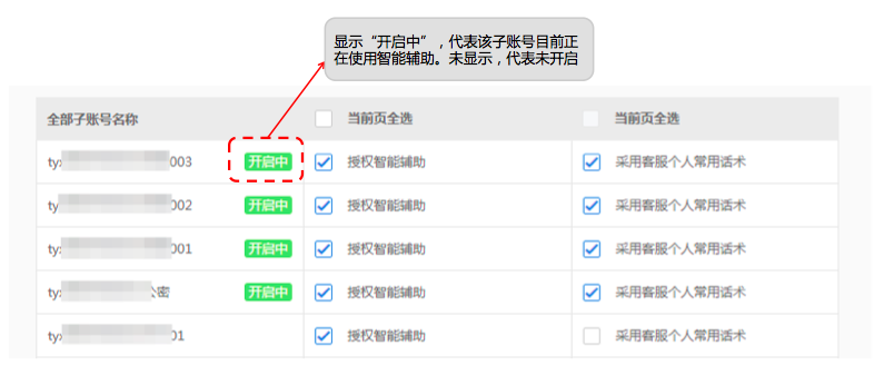 可由店铺主账号或者具有分流管理权限的账号登录店小蜜后台,在智能辅助设置-子账号授权页面中,如果子账号名后面跟着绿色的【开启中】标识,则代表该子账号的智能辅助开启中哦(不区分是否有登陆千牛),如下图。