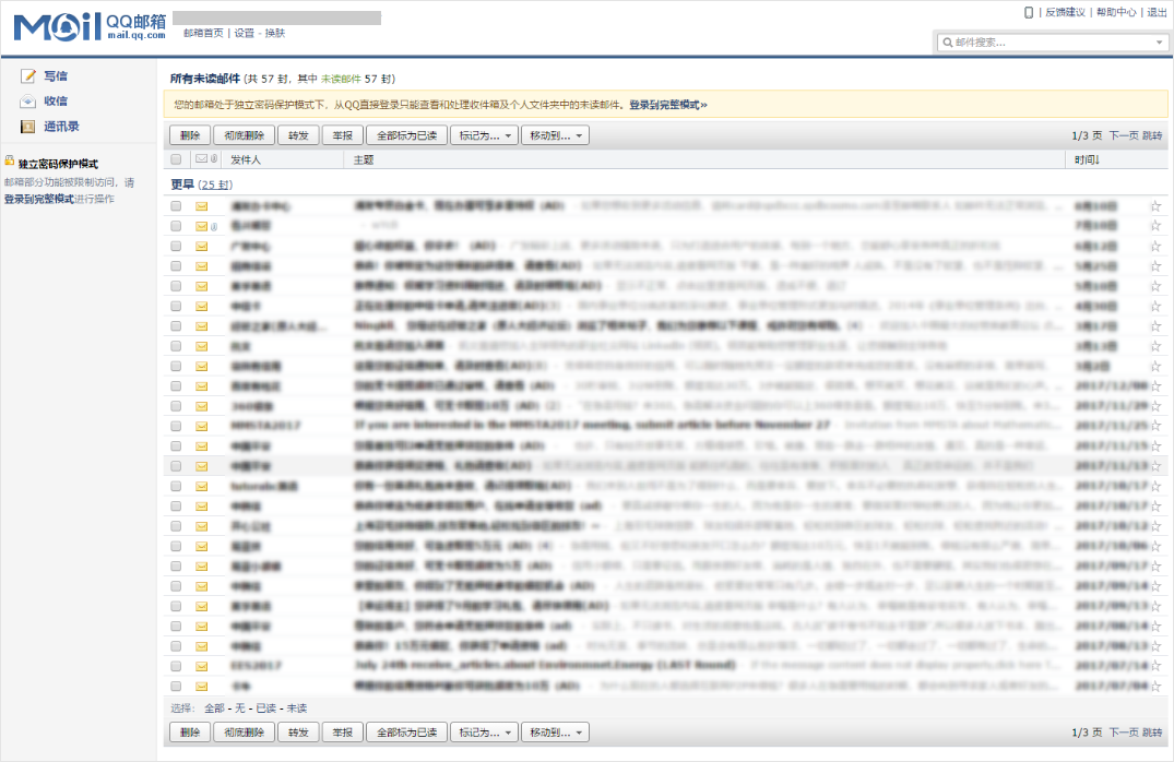 但是,如果作为邮箱的重度用户,QQ邮箱的体验是无与伦比的。QQ邮箱在1080高度的显示器上,能在一页显示完整个列表。对于经常要按时间找邮件的人,非常方便。哪怕在小一点的屏幕上,也只要稍微滚动一下鼠标滚轮,就能看全。