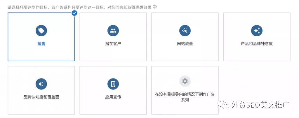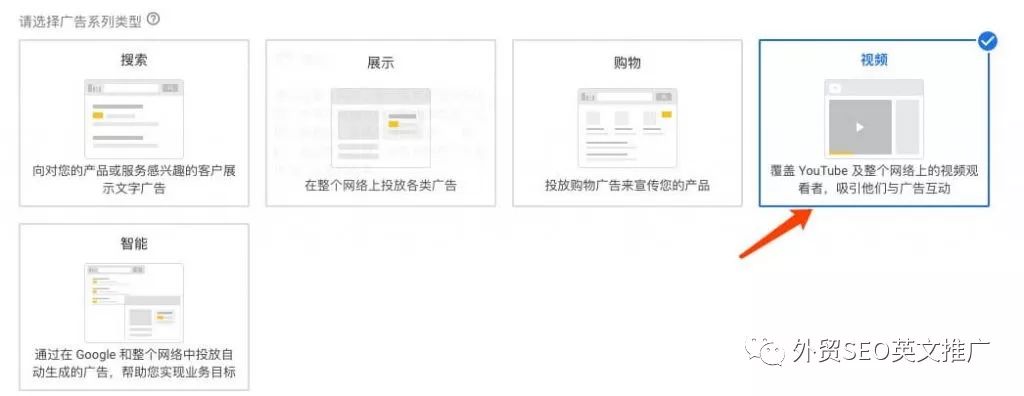 (1)选择目标,设置广告系列类型为视频,并选择具体的广告系列子类型