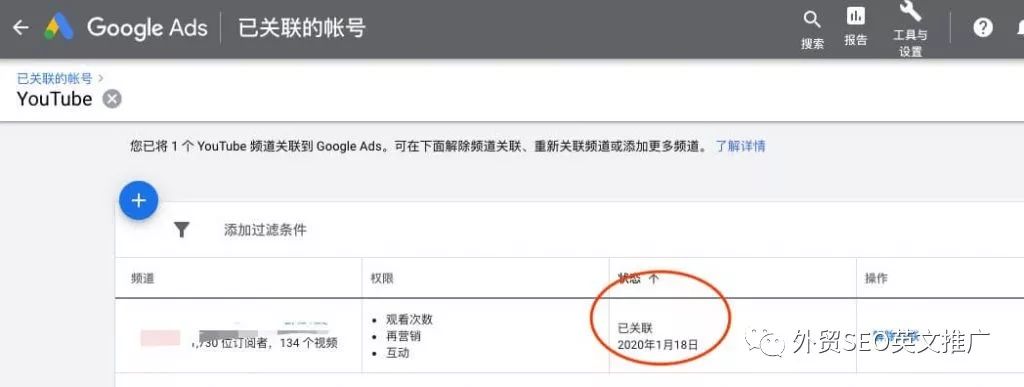 有的广告系列要求视频来源必须是与Google Ads 帐号关联的频道。另外,两者关联后,你可以深入了解观众如何与视频广告互动,还可以向互动者开展再营销活动等。