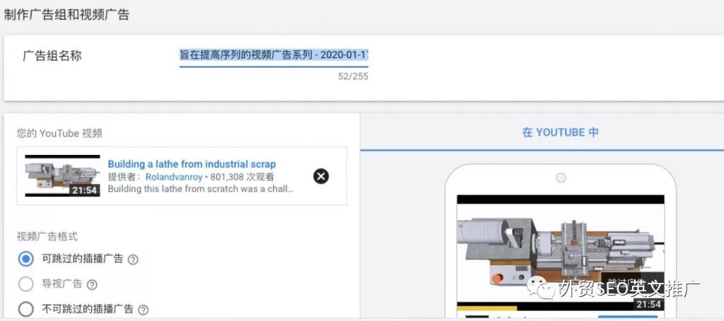 若设置目标为销售、潜在客户或网站流量,则对应的广告系列子类型为吸引用户完成转化。可选择的视频广告格式只有“可跳过的插播广告“。