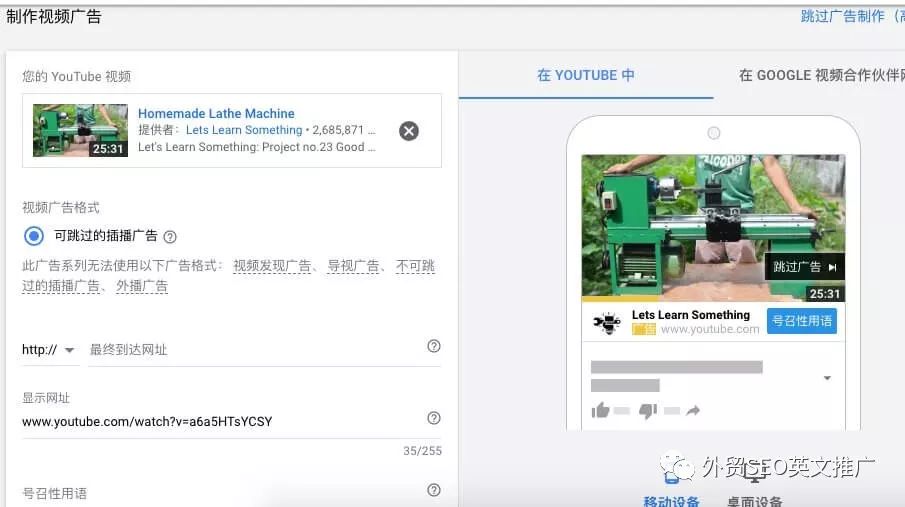 然后,输入投放视频的Youtube网址,完善与第一步中一样的广告信息:包括广告格式、最终到达网址等。