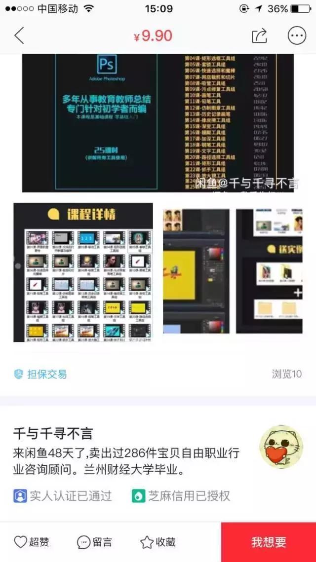 有人发布了这个商品,继续探索。随便选一个卖家进去看看,拉到详情页下面,这个人来闲鱼48天,卖了286件宝贝;继续观察,点击进入他的个人主页,发现他不止卖ps教程,还卖其他的虚拟课程,而且定价都是9.9。