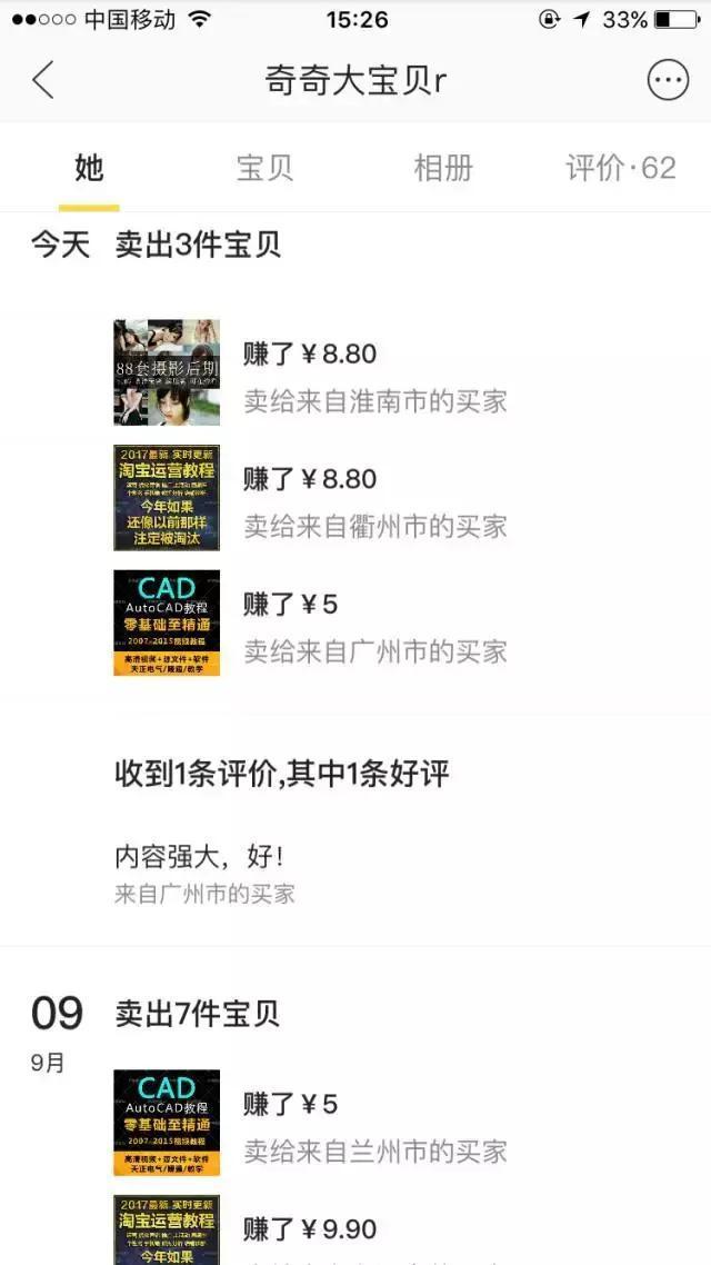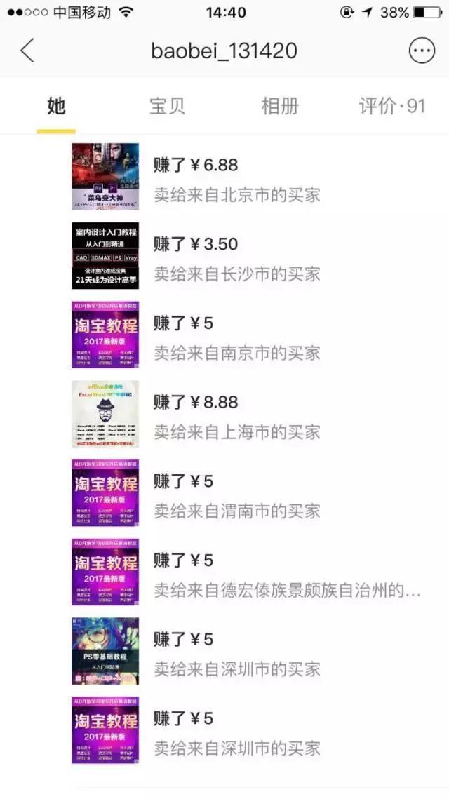 浏览成交记录,发现ps教程有成交。但是为了确定ps教程不是冷门产品,我们需要多观察几个卖家,来确认这个产品是可以持续,而且是有需求的。