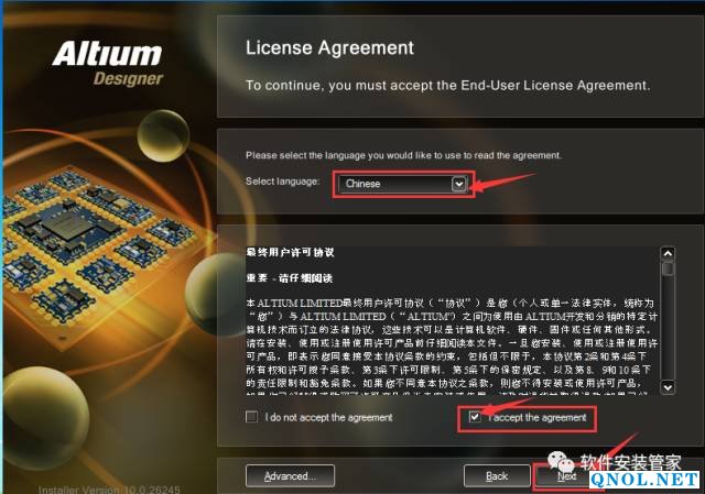 4.选择“Chinese”,再选择“laccept the agreement”,点击“Next”。
