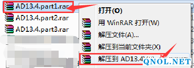 1.右击“AD13.4.part1.rar”文件,点击“解压到AD13.4”。