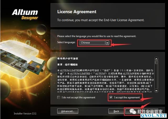 4.选择“Chinese”,再选择“l accept the agreement”,点击“Next”。