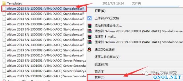 11.在解压目录中找到“Licenses”文件夹,并且打开,右击里面的“Altium 2013 SN-1300001 (V4NL-XACC) Standalone.alf”文件,选择“复制”。