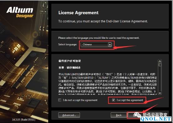 4.选择“Chinese”,再选择“l accept the agreement”,点击“Next”。
