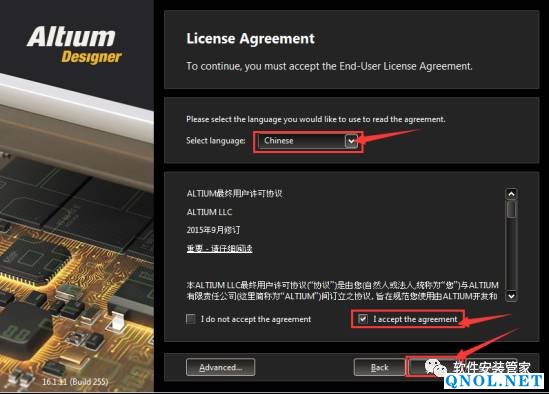 4.选择“Chinese”,再选择“l accept the agreement”,点击“Next”。