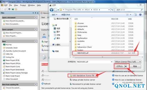 15.点击“Add standalone license file”, 在软件的安装目录下找到“NB201601.alf”文件,选择文件,点击“打开”。