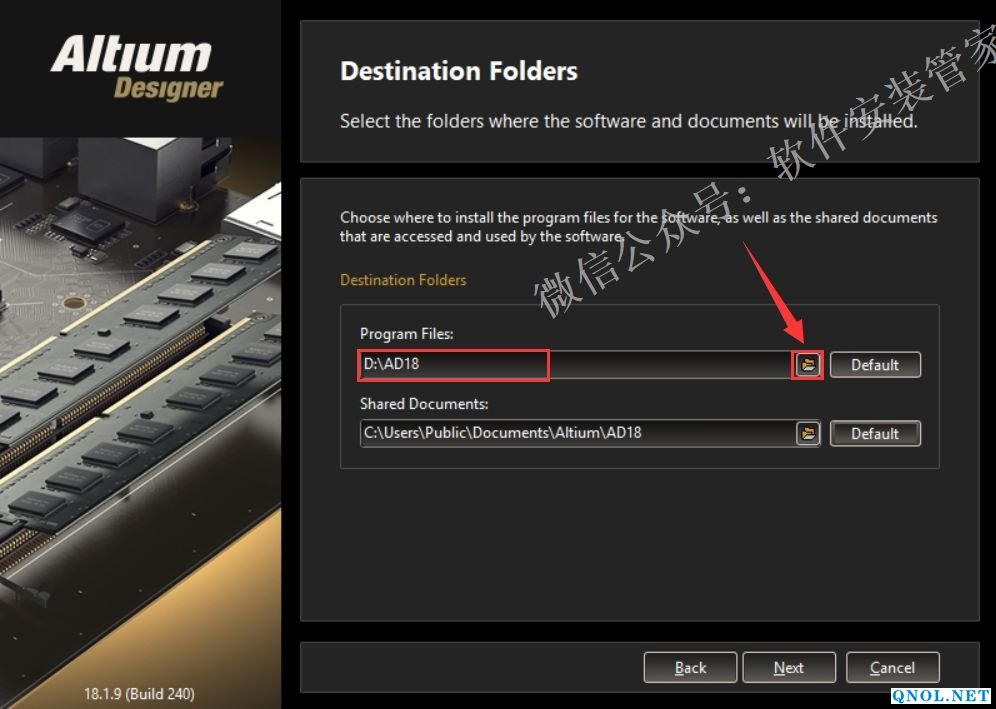 8.点击文件夹图标更改软件的安装目录,建议安装在除C盘之外的磁盘,可在D盘或其他盘新建一个【AD18】的文件夹。