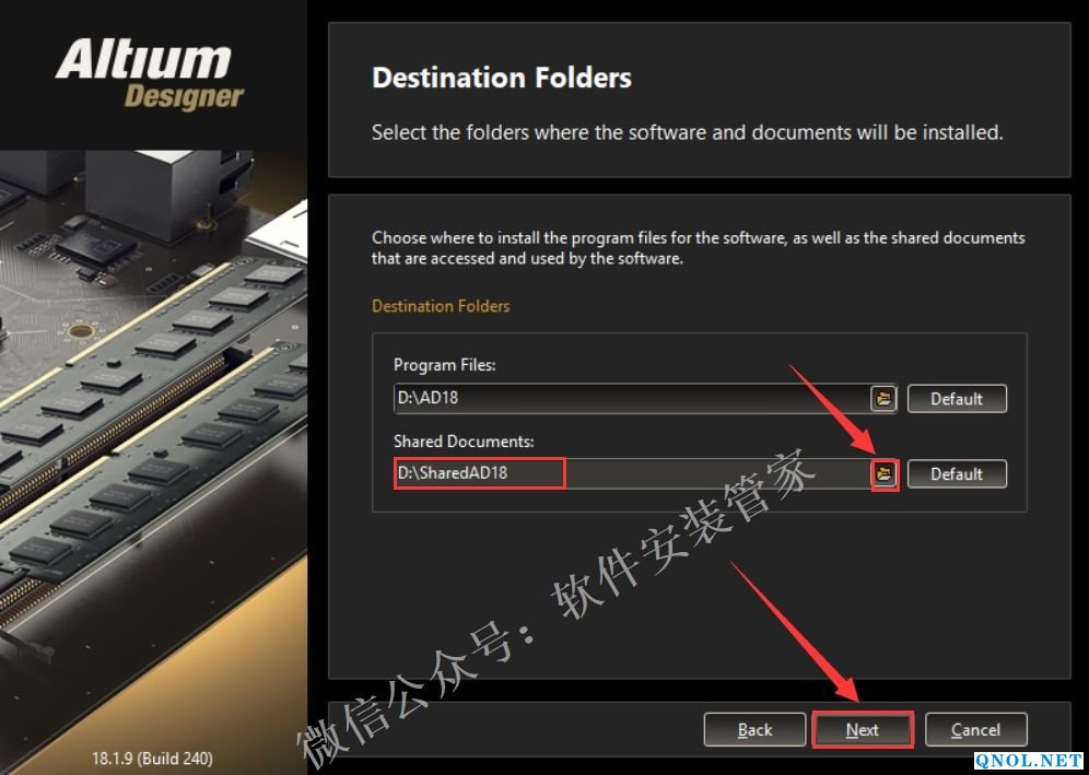 9.点击文件夹图标更改软件的共享目录,建议安装在除C盘之外的磁盘,可在D盘或其他盘新建一个【SharedAD18】的文件夹,然后点击【下一步】。
