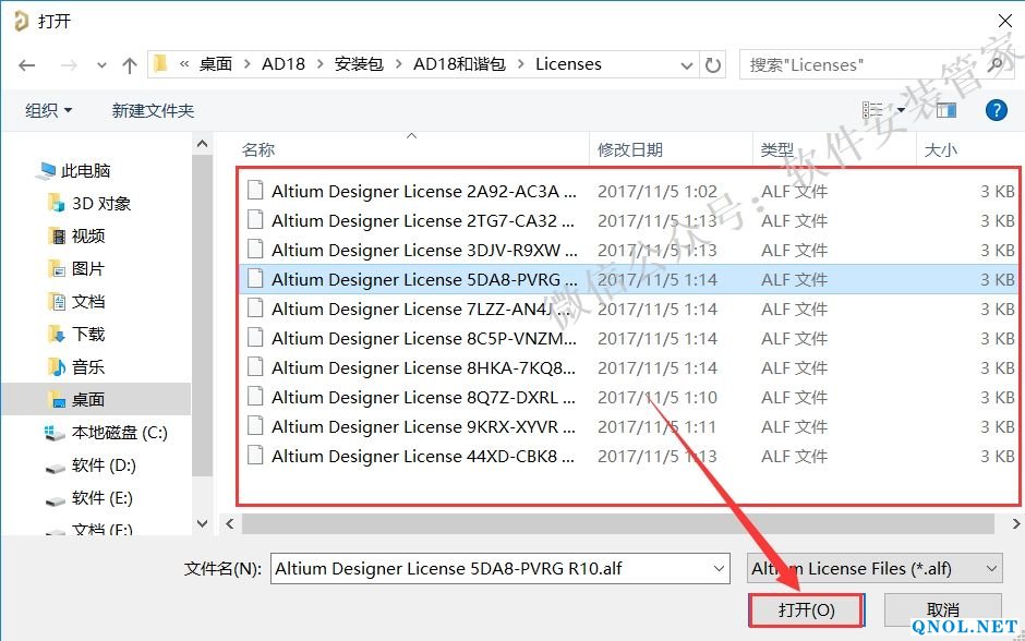 22.找到解压后的【AD18】文件夹,打开里面的【AD和谐包】文件夹再打开【Licenses】文件夹,随意选择一个文件,然后点击【打开】。
