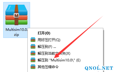 1、选择下载的软件压缩包,鼠标右击选择解压到“Mulitisim10.0\(E)”。