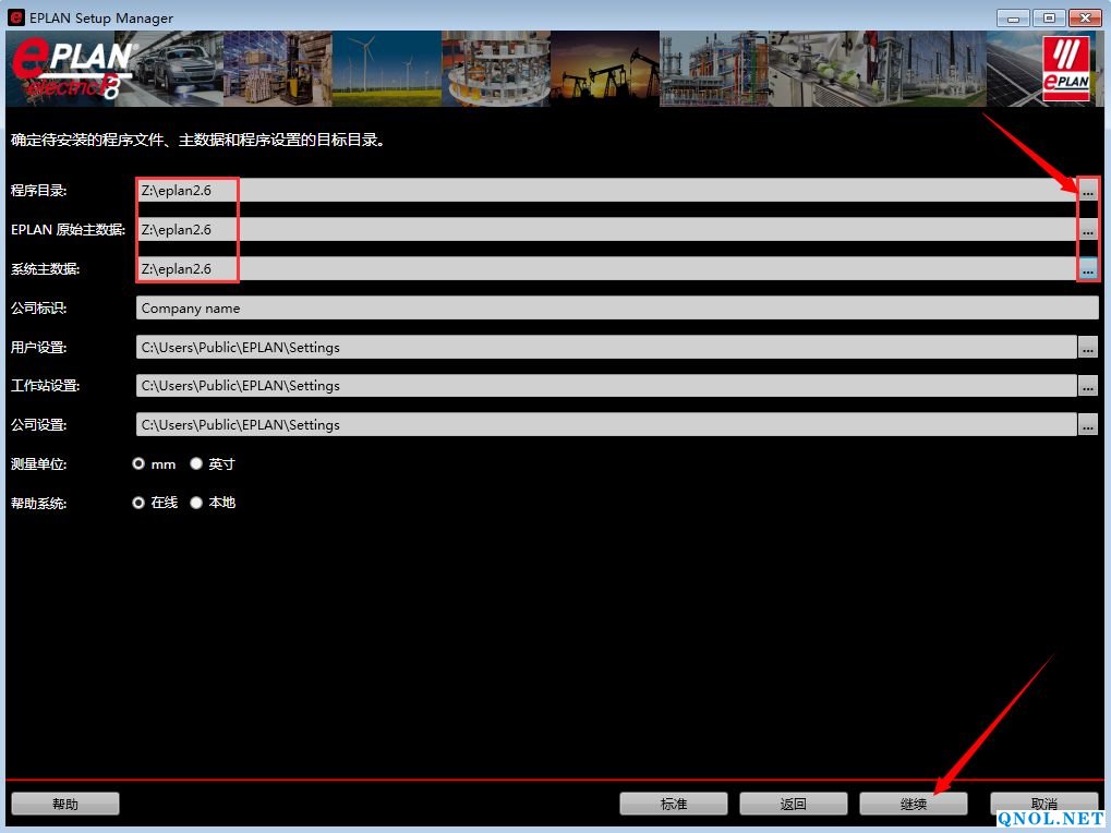 5、分别点击程序目录、EPLAN原始、系统主数据三项后面的…更改安装路径,建议安装在除C盘以外的其它磁盘。可以在D盘或者其它盘创建一个eplan2.6文件夹。然后点击继续。