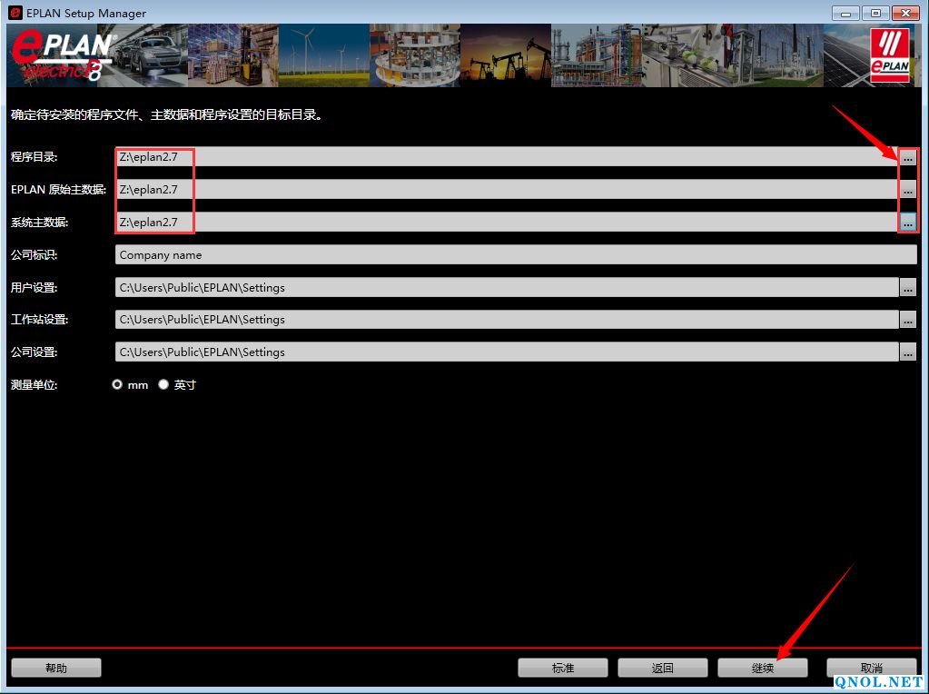 5、分别点击程序目录、EPLAN原始、系统主数据三项后面的…更改安装路径,建议安装在除C盘以外的其它磁盘。可以在D盘或者其它盘创建一个eplan2.7文件夹。然后点击继续。