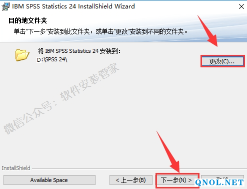 10.点击【更改】更改软件的安装路径,建议安装在除C盘之外的其它磁盘,可以在D盘或者其它盘新建一个【SPSS 24】文件夹,然后点击【下一步】。
