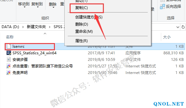 15.打开安装包解压后的【SPSS 24 64位】文件夹,鼠标右击【lservrc】选择【复制】。