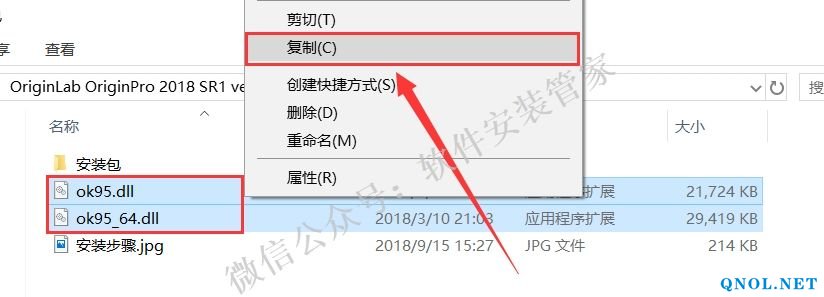 19.在解压后的【Origin 2018】文件夹中找到【ok95】【ok95_64】两个文件并选中,鼠标右击选择【复制】。