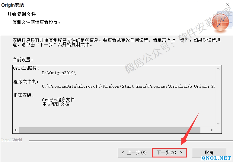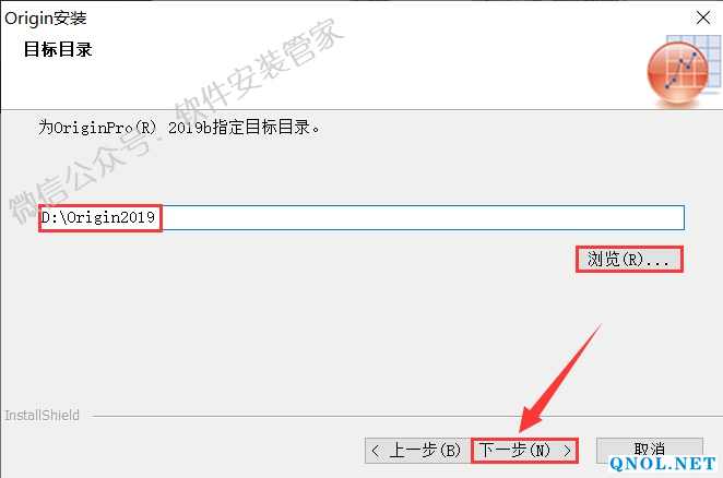 11.点击【浏览】更改软件安装路径,建议安装在除C盘之外的其它磁盘内,可在D盘或其它磁盘内新建一个【Origin2019】文件夹,然后点击【下一步】。