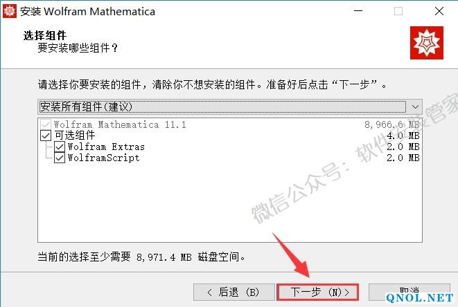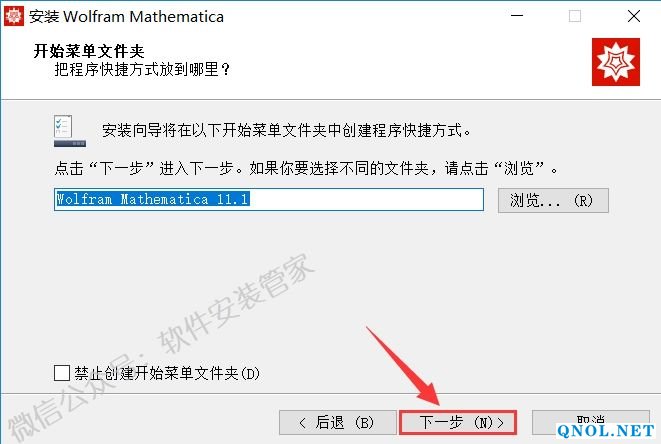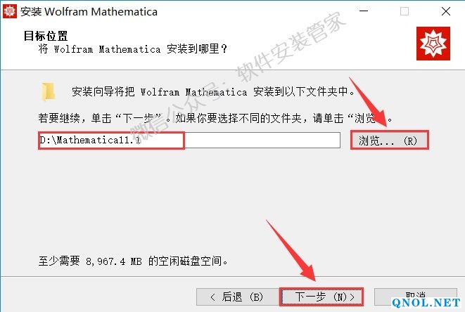 7.点击【浏览】更改软件的安装路径,建议安装在除C盘之外的其它磁盘,可以在D盘或其它磁盘新建一个【Mathematica11.1】文件夹然后点击【下一步】。
