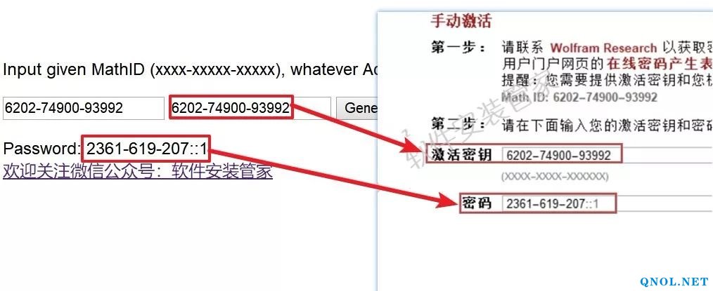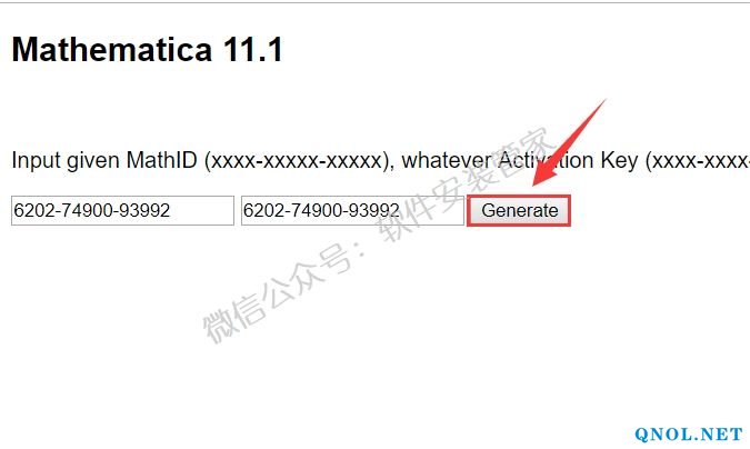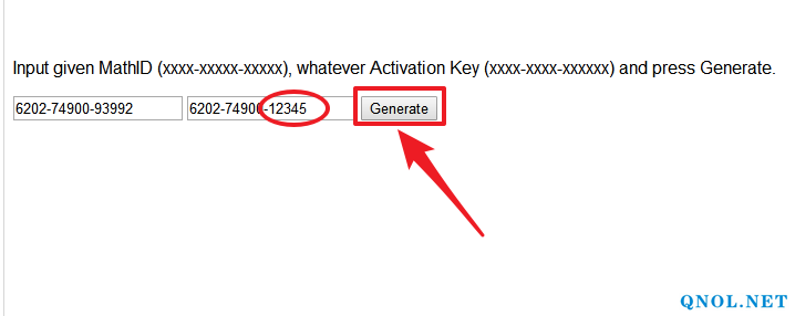 19.在两个框中手动输入第17步的【Math ID】然后点击【Generate】(注意:不能省略【-】,未激活成功不要关闭此窗口)。