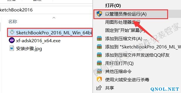 18. 打开安装包解压后的【SketchBook2016】文件夹,鼠标右击【xf-adsk2016_x64.exe】选择【以管理员身份运行】。