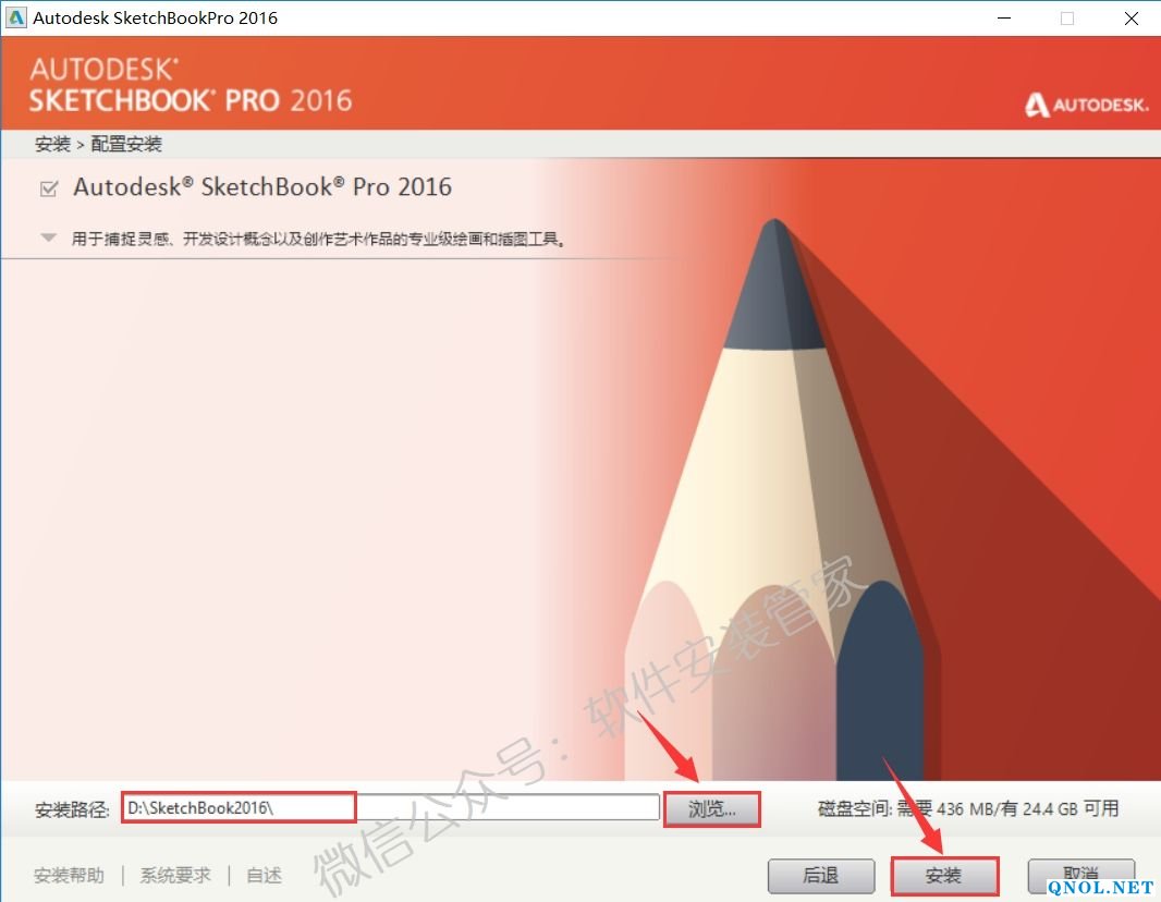 10.点击【浏览】更改软件的安装路径,建议安装在除C盘之外的其它磁盘,可以在D盘或其它磁盘新建一个【SketchBook2016】文件夹,然后点击【安装】。