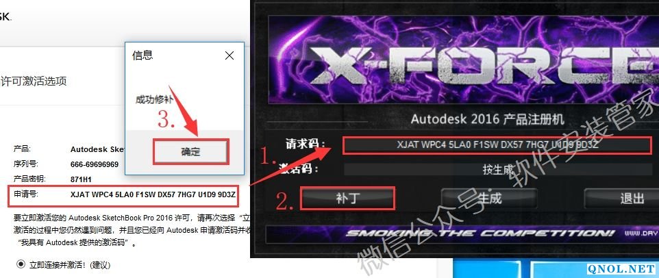 19.使用快捷键Ctrl+C复制申请号,再使用快捷键Ctrl+V粘贴到【请求码】框中,然后点击【补丁】后在弹出来的窗口中点击【确定】。