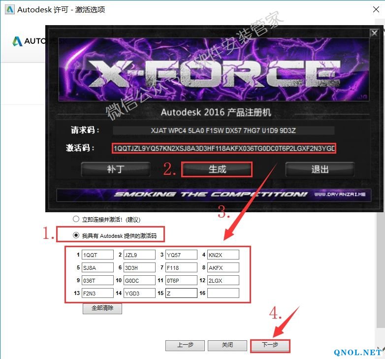 20.选择【我具有Autodesk提供的激活码】然后在注册机上点击【生成】,全选【激活码】框中生成的激活码,使用快捷键Ctrl+C复制,再使用快捷键Ctrl+V粘贴至激活界面上【我具有Autodesk提供的激活码】文字下面的框中,然后点击【下一步】。