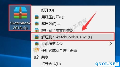 1.鼠标右击【SketchBook2018】压缩包选择【解压到SketchBook2018】。