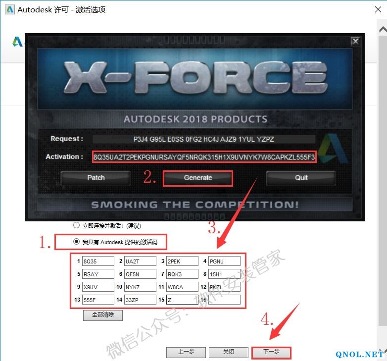 20.选择【我具有Autodesk提供的激活码】然后在注册机上点击【Generate】,全选【Activation】框中生成的激活码,使用快捷键Ctrl+C复制,再使用快捷键Ctrl+V粘贴至激活界面上【我具有Autodesk提供的激活码】文字下面的框中,然后点击【下一步】。