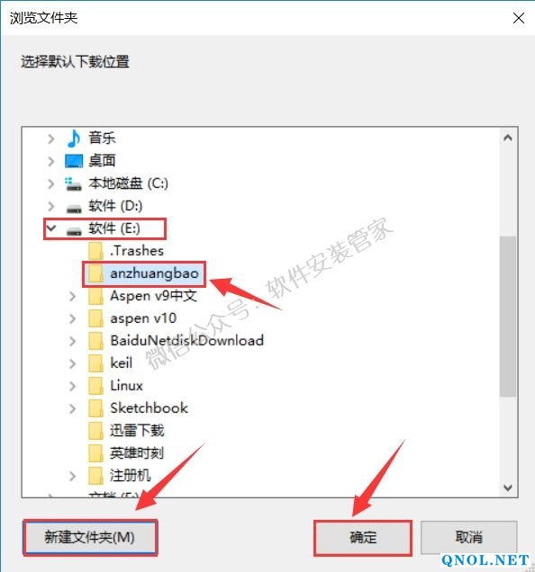 5.建议解压到除C盘之外的其它磁盘,可以在E盘或者其它磁盘新建一个【anzhuangbao】文件夹,然后点击【确定】。