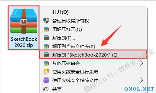 1.鼠标右击【SketchBook2020】压缩包选择【解压到SketchBook2020】。
