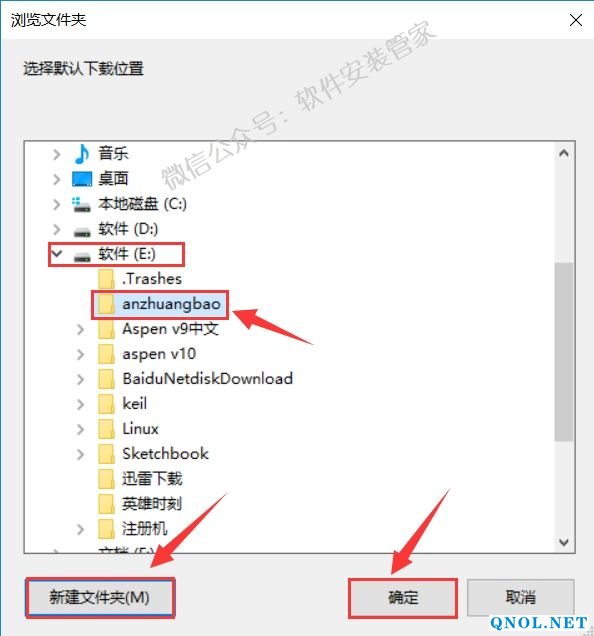 5.建议解压到除C盘之外的其它磁盘,可以在E盘或者其它盘新建一个【anzhuangbao】文件夹,然后点击【确定】。