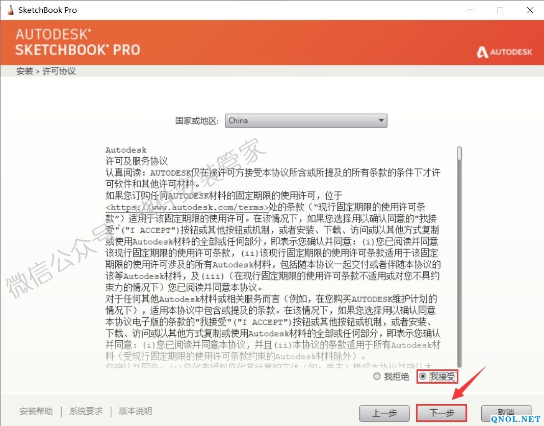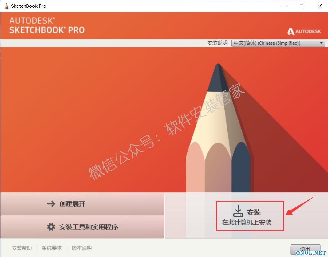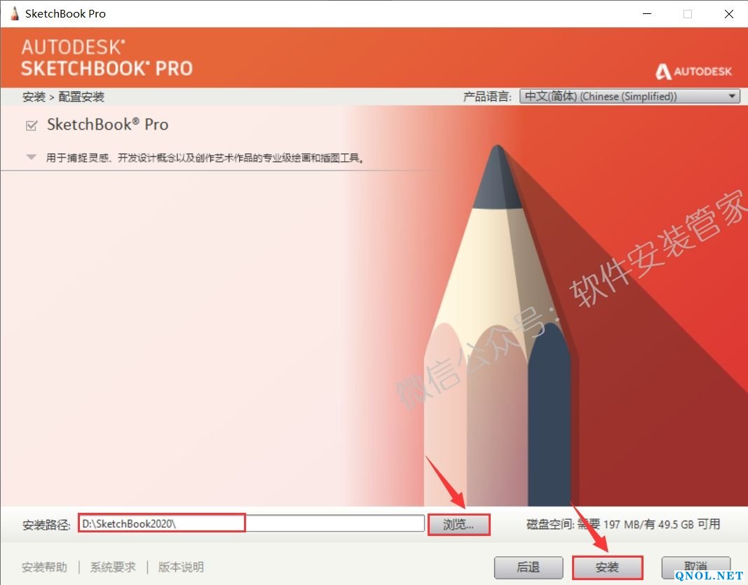 9.点击【浏览】更改软件的安装路径,建议安装在除C盘之外的其它磁盘,可以在D盘或其它磁盘新建一个【SketchBook2020】文件夹,然后点击【安装】。