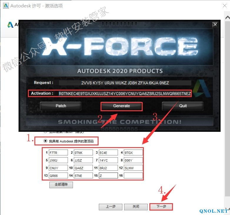 20.选择【我具有Autodesk提供的激活码】然后在注册机上点击【Generate】,全选【Activation】框中生成的激活码,使用快捷键Ctrl+C复制,再使用快捷键Ctrl+V粘贴至激活界面上【我具有Autodesk提供的激活码】文字下面的框中,然后点击【下一步】。