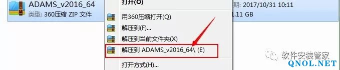 1、右击软件压缩包,选择解压到“ADAMS_v2016_64”。