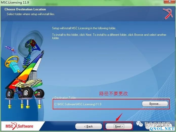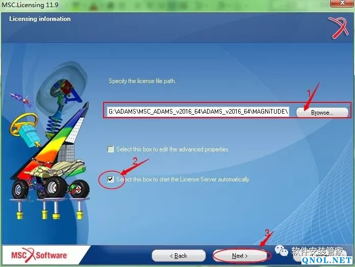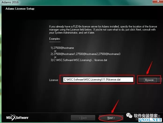 23、安装完成后会弹出以下界面,点击“Browse”选择前面生成的许可文件license.dat(许可安装中新生成的),路径C:\MSC.Software\MSC.Licensing\11.9\license.dat,然后点击Next。