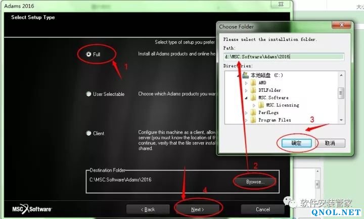 20、选择安装模式和安装目录,点击“FUll”,然后点击“Browse”更改安装路径,建议安装到除C盘的以外的其他磁盘,可在D盘新建一个Adams2016文件夹,然后点击Next。