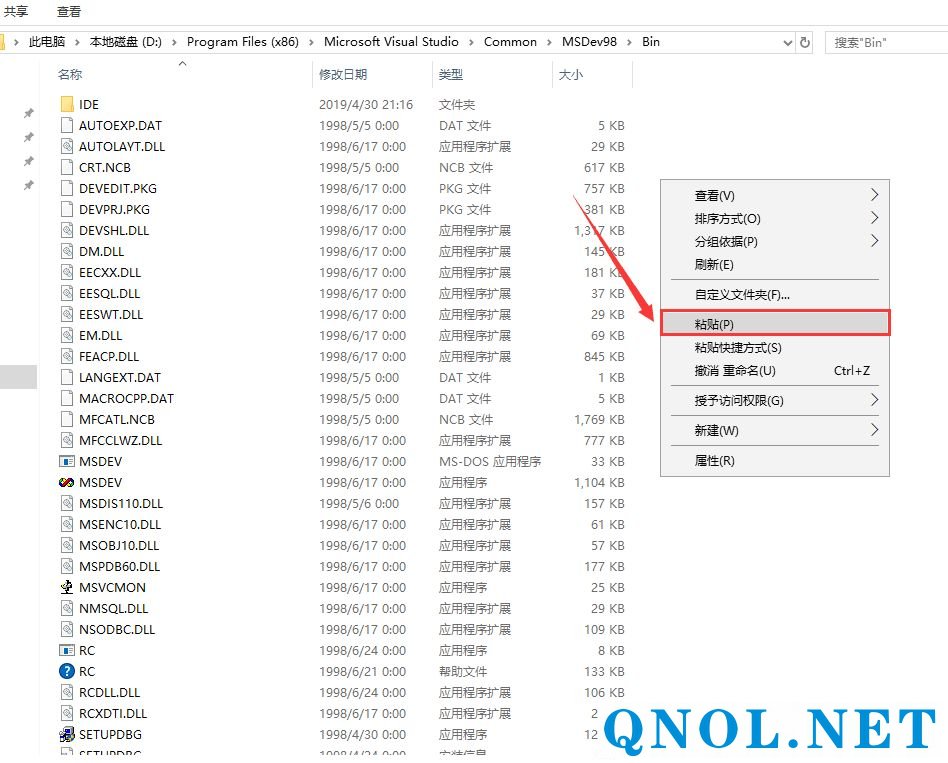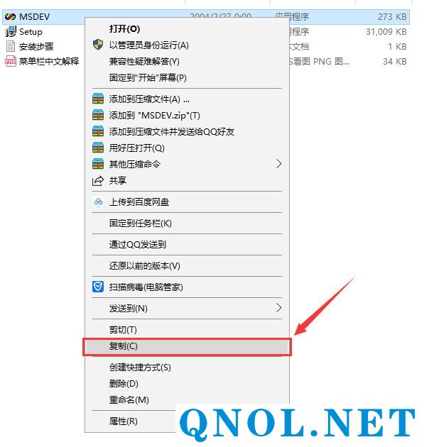 1、打开安装包解压后的文件夹找到【MSDEV】鼠标右击选择复制。