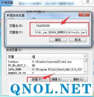12.点击“新建”,变量名输入“CLASSPATH”变量值输入“ .;%JAVA_HOME%\lib\dt.jar;%JAVA_HOME%\lib\tools.jar; ”。说明:双引号不要输入或复制到。