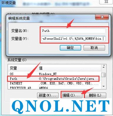 13.在系统变量中找到“Path”,点击“编辑”。在后面加入“ ;%JAVA_HOME%\bin ”。说明:双引号不要输入或复制到。
