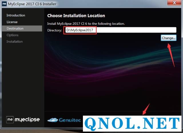 4.点击Change更改软件安装路径,建议安装到除C盘以外的磁盘,可在D盘或其它盘新建一个文件夹MyEclipse2017,然后点击Next.
