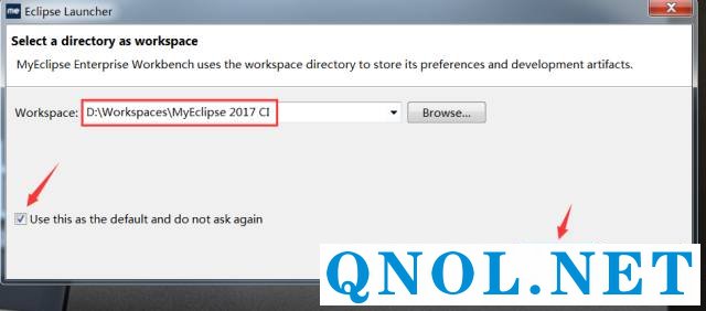 8.提示设置工作目录路径,可以根据自己的习惯设置,我这里设置为D:\Workspaces\MyEclipse 2017 CI,然后将Use this as the...勾选上,然后点击OK。