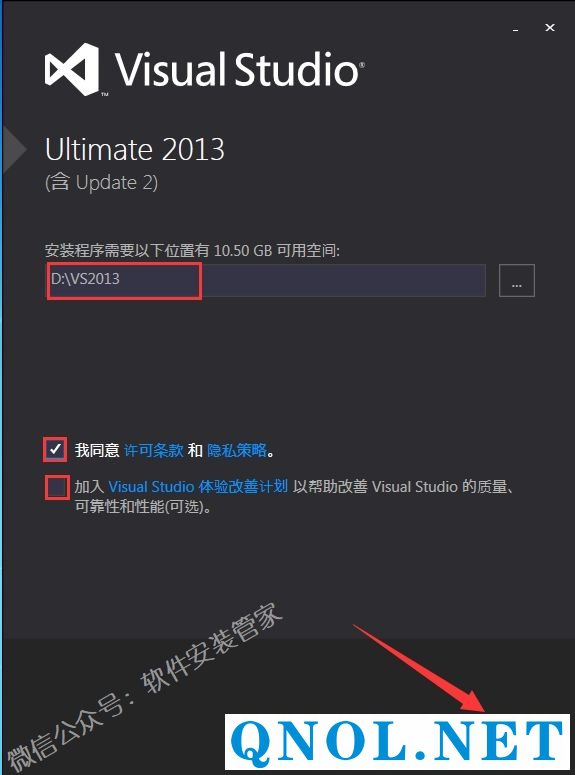 6.更改软件安装路径:建议安装到除C盘以外的磁盘,可在D盘或其它盘里面新建一个文件夹【VS2013】,勾选【我同意】,取消勾选【改善计划】点击下一步。
